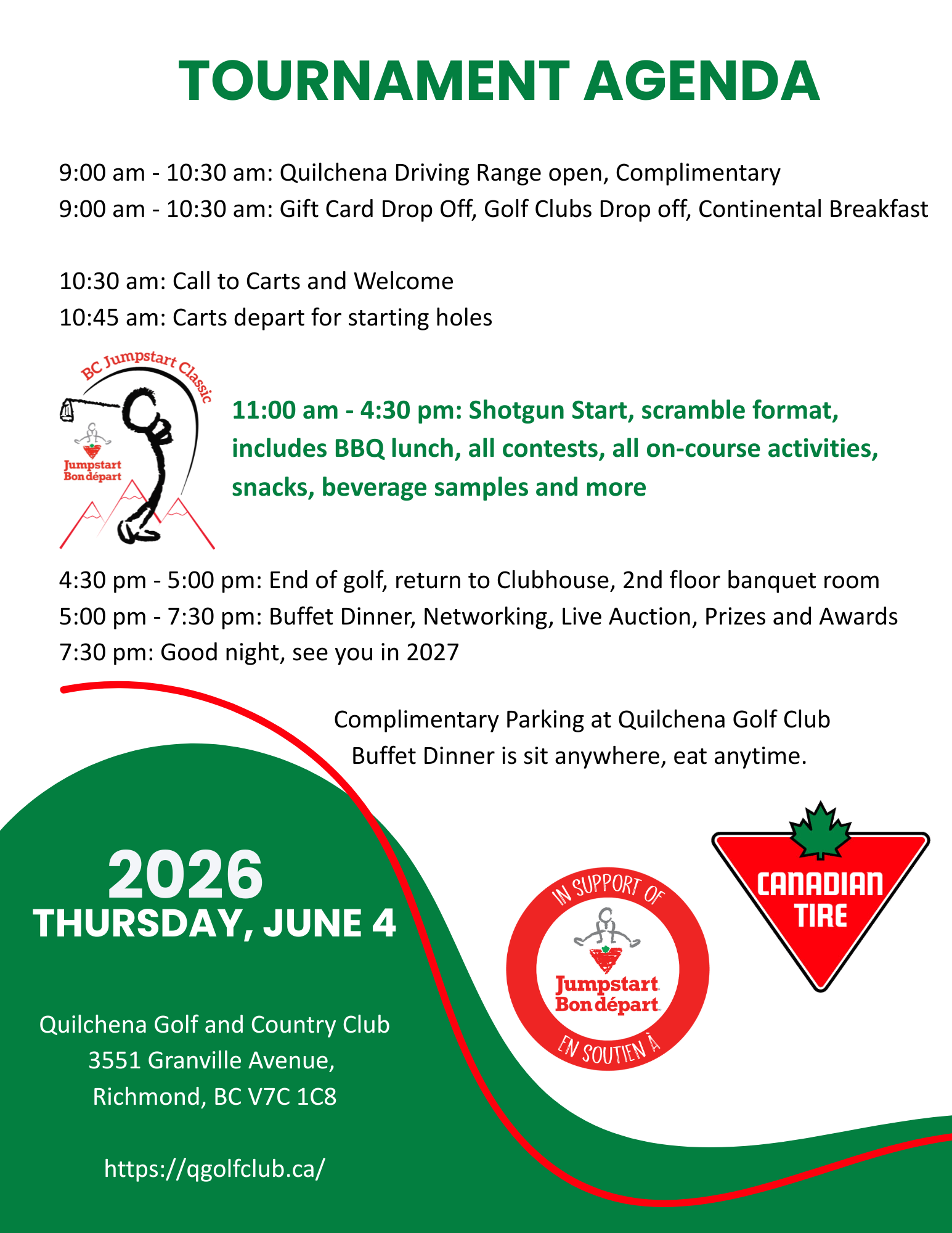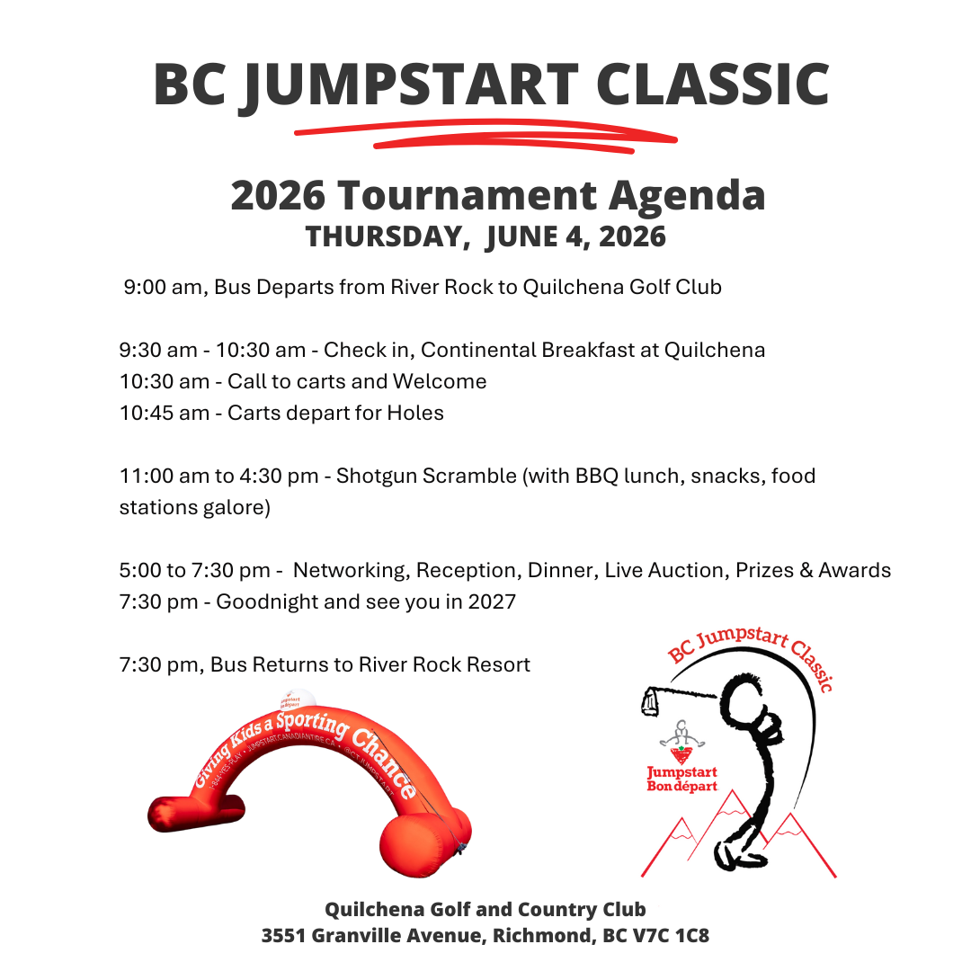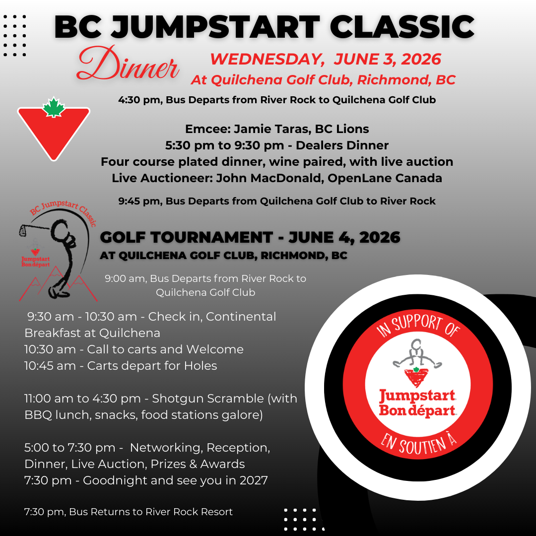 Wednesday, June 3, 4:30 pm, Bus Departs from River Rock to Quilchena Golf Club where dinner is hosted. 5:30 pm - 9:30 pm - Emcee, Stuart McReynolds, Associate Vice President (AVP), Strategy at Canadian Tire Jumpstart Charities The evening includes a keynote speaker from Jumpstart, a live auction, and the opportunity for sponsors and guests to network with BC Canada Canadian Tire store owners and management Includes:
